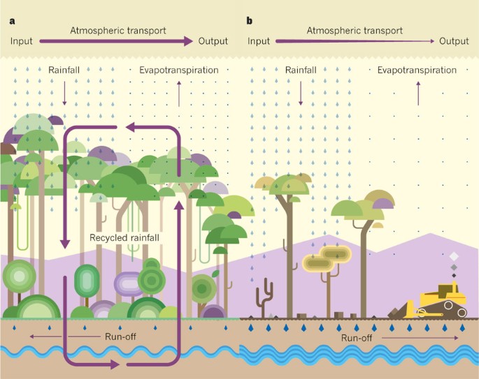 Deforestation disrupts this cycle. As forest cover declines, rainfall patterns shift, droughts intensify, and the very agricultural productivity driving deforestation becomes threatened.